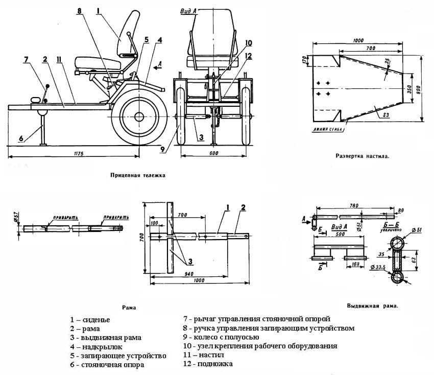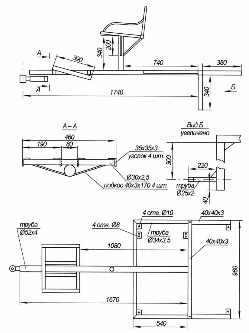 Ее называют тележка, так как она ставится на стандартное прицепное устройство. Еще до начала работы сделать чертеж со всеми размерами, либо найти готовый, вариантов много, есть из чего выбрать. Хорошо разобраться, если нужно, внести корректировки, чтобы точно подогнать изделие под свою технику. Проводить работу так: