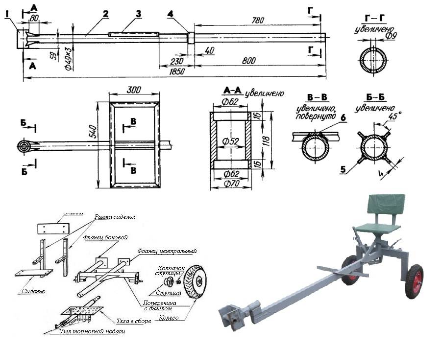 Чтобы приступить к сборке дополнительного оборудования для мотокультиватора, понадобится чертеж, в соответствии с которым будут выполнены элементы крепления и сооружение фрагментов. Если есть специальные навыки и опыт самодельный адаптер на мотоблок и чертеж можно выполнить самостоятельно. В случае опасения допустить ошибку, следует брать готовые чертежи. Перед конструированием рекомендуется проконтролировать и сверить соответствие габаритов и цифр.