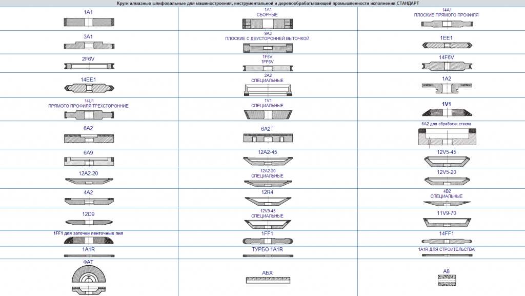 Алмазные круги для заточки инструмента имеют свою классификацию. Заводы по изготовлению абразивного инструмента выпускают алмазные диски трех форм: