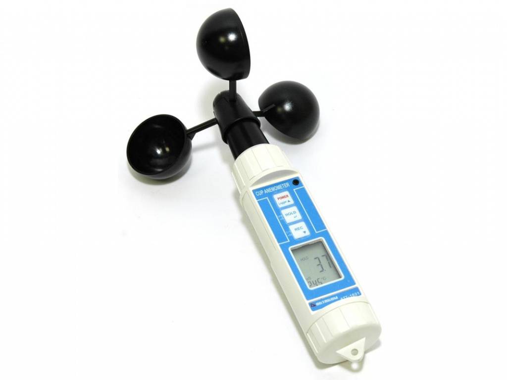 Этот тип оборудования является самым простым и работает за счет запуска вращения четырех чашек от движения ветра. Модель высчитывает скорость, деля количество оборотов на время замера. Анемометр удобен для эксплуатации на стационарном месте и подойдет для проверки тяги на производстве, яхте или ферме. Но постоянно транспортировать его с собой по разным объектам не рентабельно.
