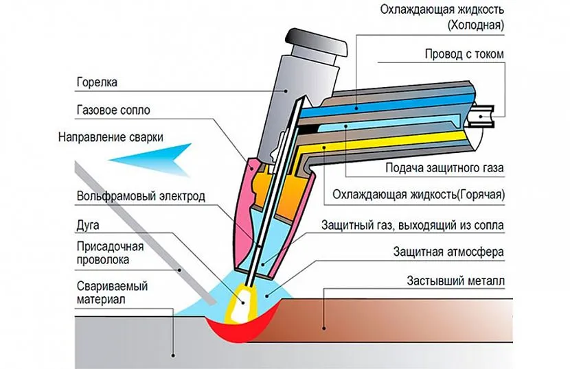 Рабочим органом сварочного аппарата является горелка. В центральную ее часть вставляют вольфрамовый электрод с вылетом 2−5 мм. Внутри горелки электрод фиксируется специальным держателем, в который можно вставить вольфрамовый стержень. Для подачи защитного газа горелку оснащают керамическим соплом. Шов формируется с помощью присадочной проволоки, состав которой должен соответствовать составу свариваемого металла.