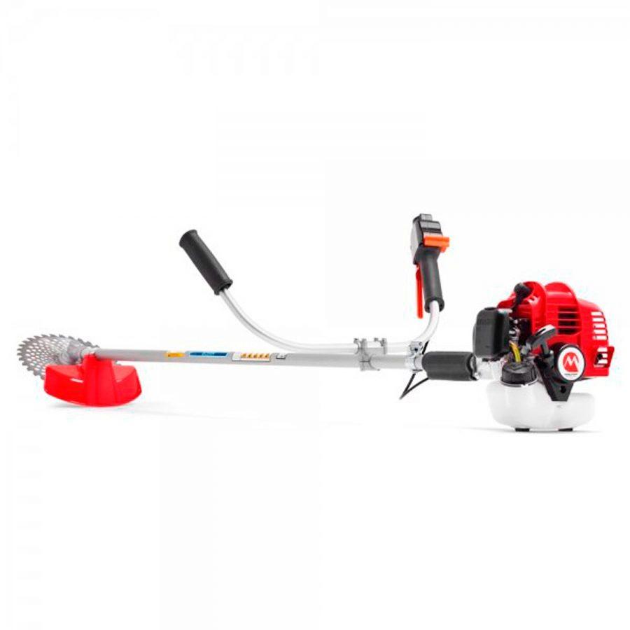 Триммер с двигателем мощностью 1.8 л. с. рассчитан на профессиональное использование. С легкостью косит густые растения и кустарники на любых поверхностях, в том числе и бугристых. Двуручная рукоятка обеспечивает комфорт при использовании. В качестве режущего элемента применяются ножи, которые справляются с сучковатыми кустами и тонкими деревцами.