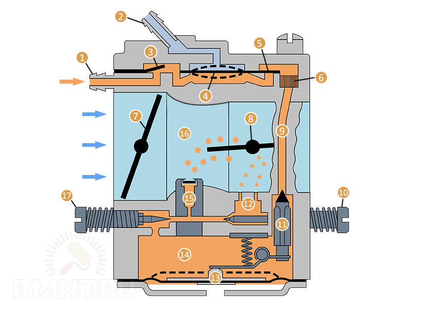 Устройство карбюратора Walbro: 1 — входной топливный штуцер; 2 — импульсный канал мембранного насоса; 3 — впускной клапан; 4 — мембрана топливного насоса; 5 — выпускной клапан; 6 — фильтрующая сетка; 7 — воздушная заслонка; 8 — дроссельная заслонка; 9 — топливный канал; 10 — винт регулировки холостого хода; 11 — игла; 12 — жиклёры холостого хода; 13 — управляющая мембрана; 14 — топливная камера; 15 — главный жиклёр; 16 — диффузор; 17 — главный регулировочный винт