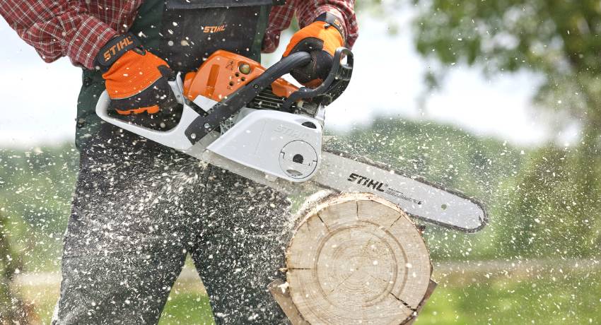 Перед началом работы проверяют правильность натяжения цепи на провисание и свободный ход вдоль шины. Цепной тормоз должен быть включен. Запуск выполняют на ровном месте: правая нога находится на задней ручке пилы, левая рука удерживает переднюю рукоятку. При холодном запуске после открытия дроссельной заслонки следует дернуть ручку стартера.