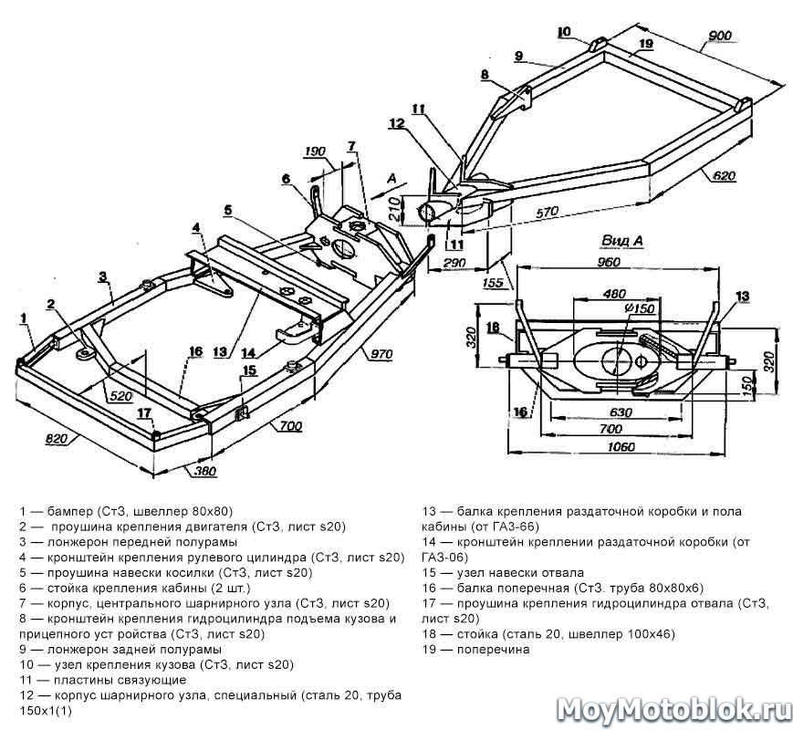 - Обустраивается рама. Она должна быть прочной и надежной. Обычно применяют мотоциклетную готовую раму, но при определенных навыках можно обрезки труб сварить между собой. На эту деталь будет производиться значительная нагрузка, так как именно на нее крепится двигатель и все основные узлы. Ко всему агрегату рама присоединяется при помощи двух специальных штифтов и поворотного шарнира.