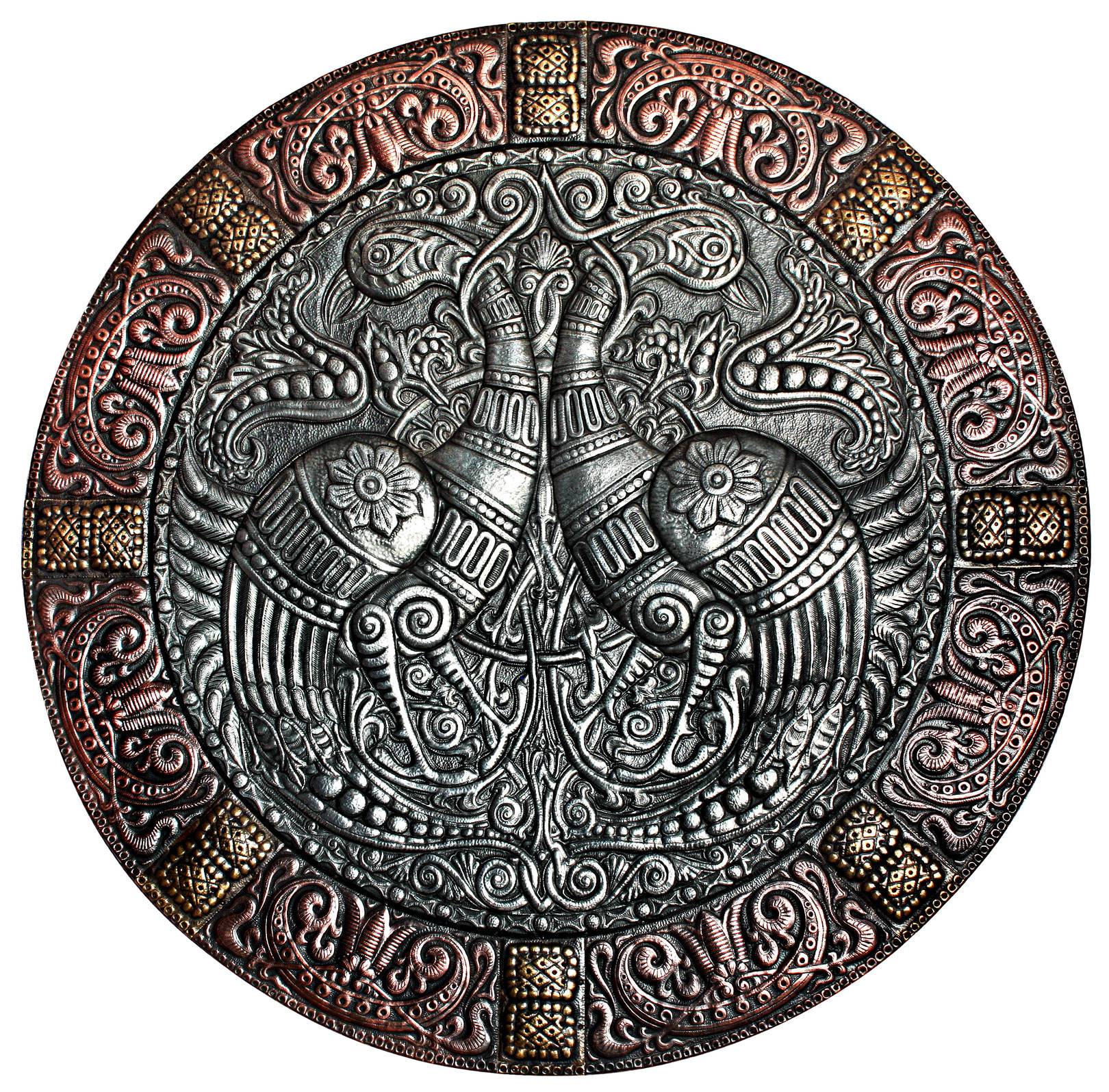 Волшебные птицы (панно-рондо) 2008 г. Алюминий, медь, латунь; чернение, холодная эмаль 90 х 90 см