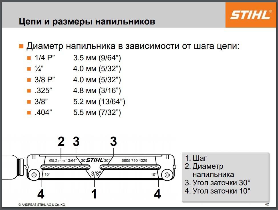 У компании Stihl разработаны специальные рекомендации для заточки шины напильником или шлифовальным кругом. Общий алгоритм работы остается аналогичным. В таблице приведены требования к выбору полотна диаметра в зависимости шага цепи.