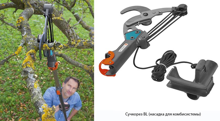 Сучкорез BL (насадка для комбисистемы) с 5-ступенчатым приводом идеально подходит для обрезки свежих веток на высоких деревьях. В сочетании с телескопической рукояткой комбисистемы GARDENA ветви можно легко срезать без стремянки. Предохранитель гарантирует безопасную работу.