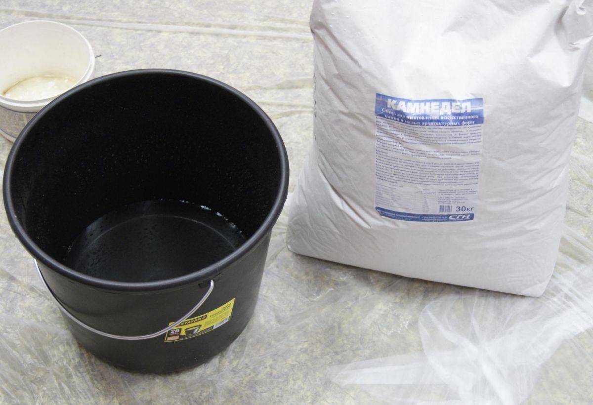 - Сначала замешивается гипс с водой. Масса должна иметь консистенцию жидкой сметаны. При этом используют миксер, который предотвращает появление комочков в гипсовой массе и удаляет пузырьки воздуха.