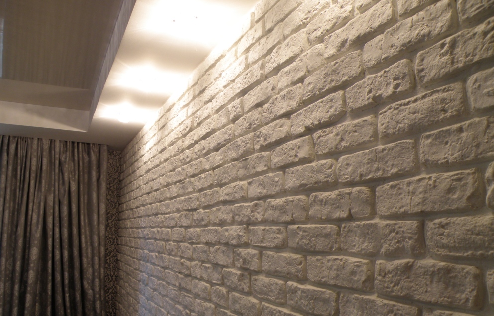 - Можно облицевать гипсовой плиткой и кирпичную стену при условии, что кладка выполнена аккуратно, швы между кирпичами ровные и без пустот. При оклеивании подобной поверхности нужно использовать клей для кафельной плитки. Также лучше предварительно сделать на стене насечки, а после покрыть поверхность грунтовым составом. В том случае, если кладка кирпича старая, нужно зачистить стену от высолов, покрыть грунтовкой и штукатуркой.