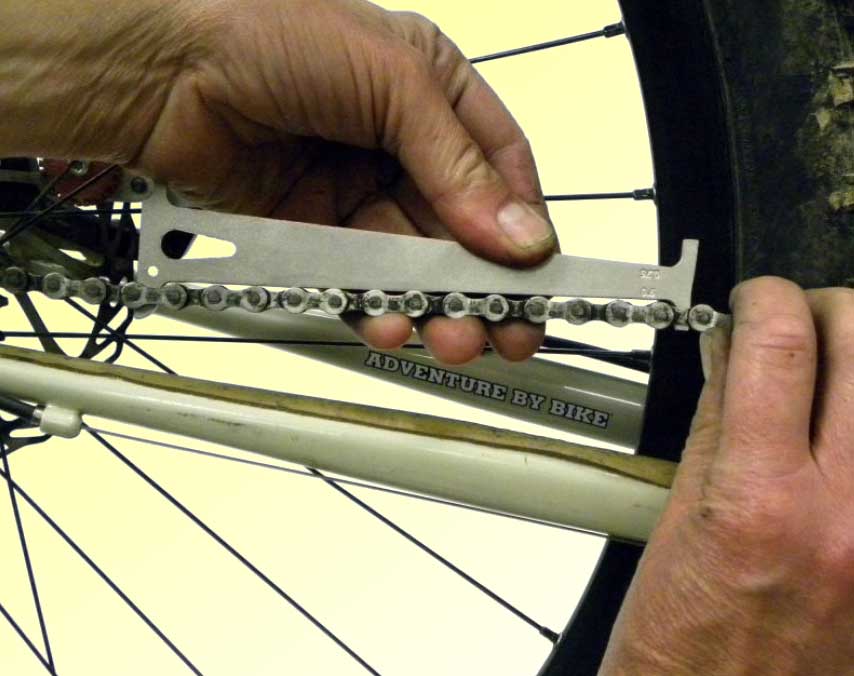 Второй вариант проверки изношенности с применением специальных калибров: индикатор износа цепи велосипеда указывает степень допустимого удлинения в процентных соотношениях от 0; 0.5 до 0.75 и 1.