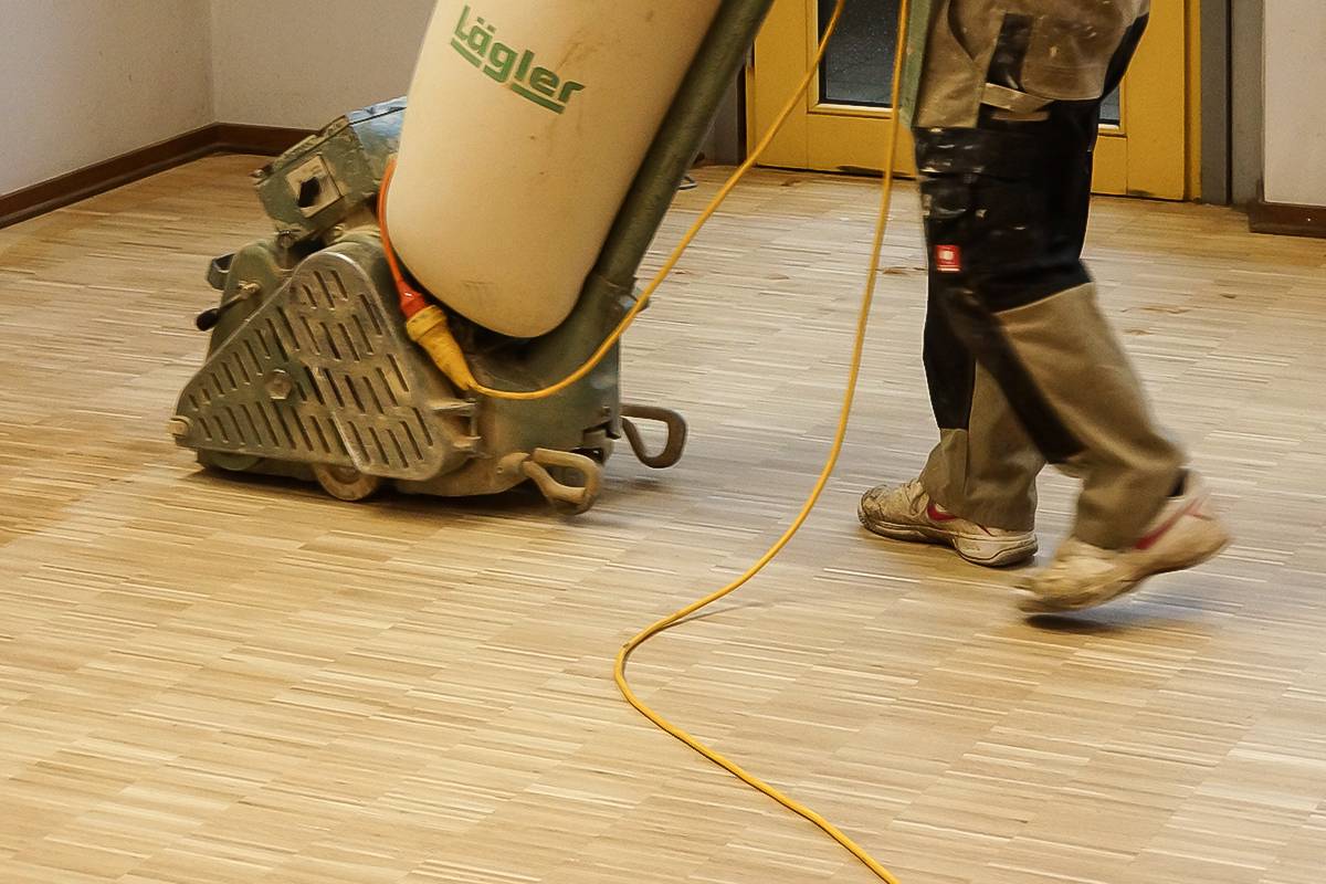 Обработка, то есть снятие верхнего слоя древесины, выполняется в разных направлениях, чтобы не образовался уклон в одну из сторон. Работа производится от середины комнаты, сначала жесткими абразивами, после – более мягкими. Во время шлифовки удаляются следы от крупных абразивных материалов, полученная пыль впоследствии используется для заделки щелей между ламелями. Для совсем нового паркета рекомендуется проведение еврошлифовки. При замене множества деталей, полы, после выравнивания, тонируются морилкой, для получения однородного окраса.