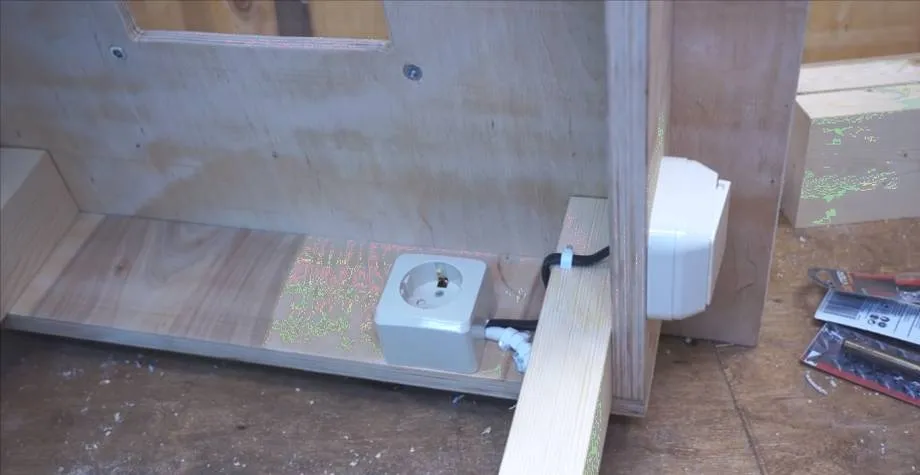Далее к внутренней части основы стола приделайте розетку, которую нужно подключить к выключателю, что будет стоять на внешней части стола и подключён к сети.