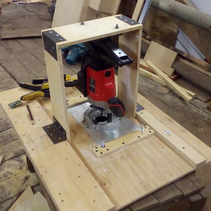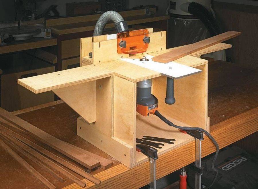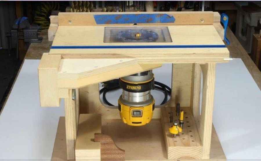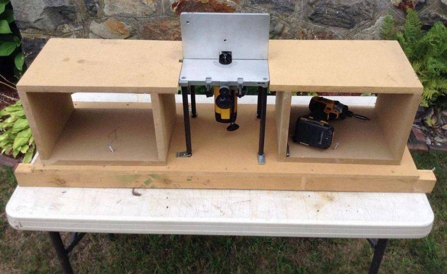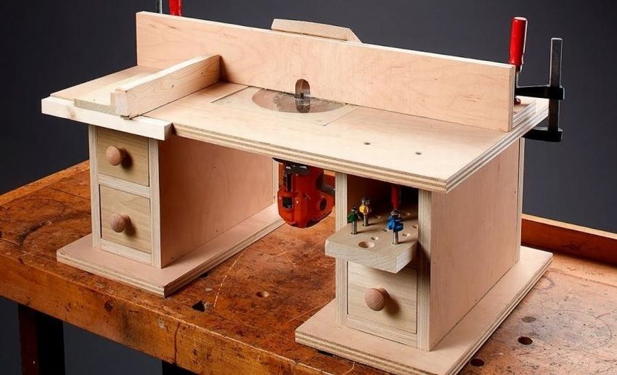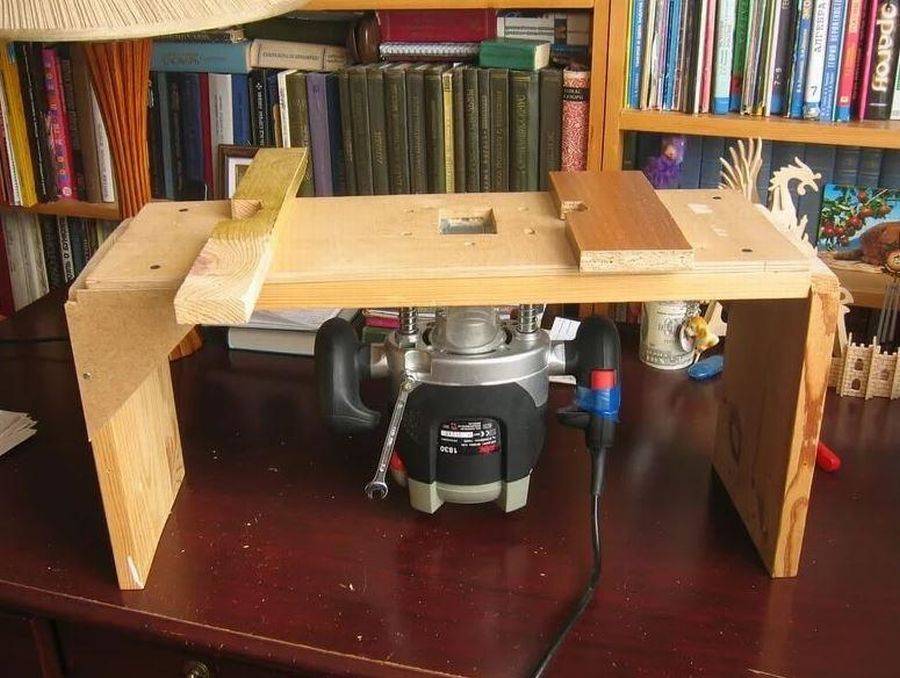 Каждый мастер изготавливает фрезерный стол под себя, изобретая свою конструкцию или переделывая чертежи других. Чем больше работы будет выполняться на устройстве, тем прочнее и надежнее, должно быть основание. Любителям порядка, у которых все лежит на строго определенном месте, стоит сделать станок из письменного стола или самому изготовить основание и тумбы с ящиками. В мастерской с большим объемом столярных работ подойдет комбинированное приспособление с дополнительным местом под лобзик и дисковую пилу. Для тех, кто периодически изготавливает поделки для дома, подойдет переносной столик, который всегда можно поставить за несколько минут и прикрутить к нему фрезер.