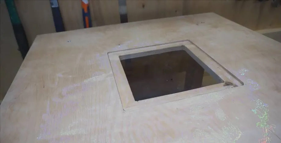 Далее вам нужно будет сделать пропил в столе между оргстеклом и краем. Снизу приложить основание циркулярной пилы, сделать отметки, где она будет крепиться, просверлить отверстия.