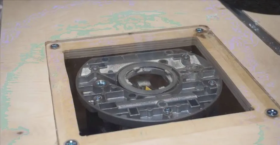 Ручной станок крепится подошвой в обратной стороне фрезерной пластины через отверстия в основании или с помощью скоб, фиксирующих корпус. В крышке фрезерного стола делается выборка – занижение, по размеру фрезерной пластины. В нем делается большое отверстие. Места под крепление по углам подмечаются по пластине до закрепления фрезера. Сразу накерниваются места под регулировочные винты по центру сторон прямоугольника. Собранный узел устанавливают на фрезерном столе, опустив фрезер вниз вместе с кабелем. Закручивают винты по углам. Выставляют пластину в плоскости фрезерного стола.