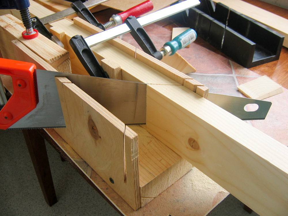 - после того как левый и правый углы будут отпилены, обе заготовки совмещают и проверяют на плотность прилегания частей между собой.