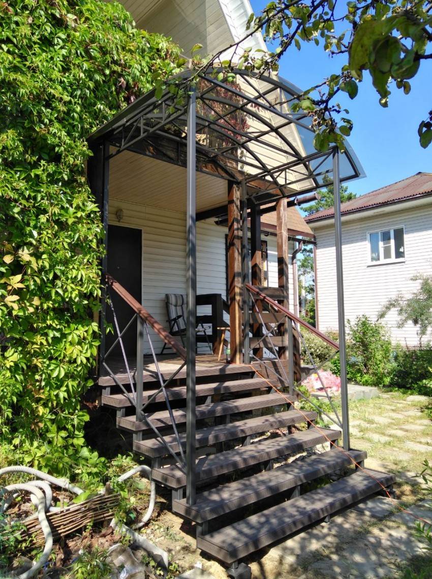 - Крыльцо — обязательная часть дома. Оно состоит из нескольких элементов: лестницы, ограждений, санитарной зоны и навеса. Причем последняя часть конструкции должна быть обустроена отдельно от основного ската крыши.