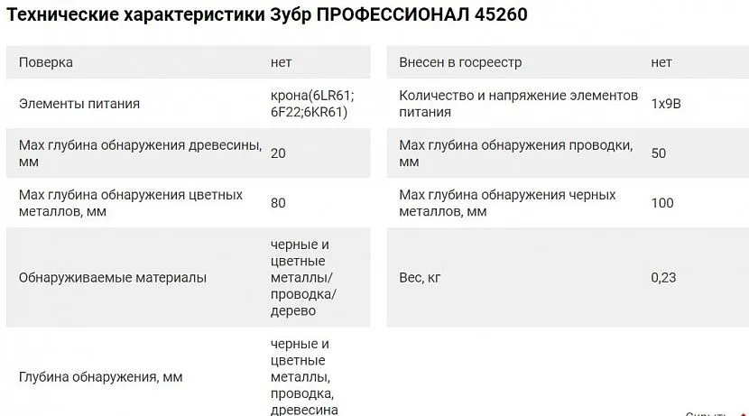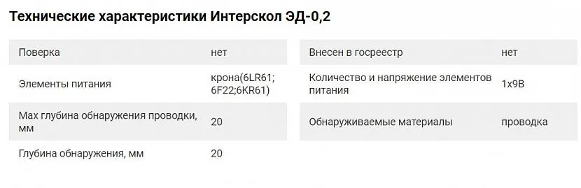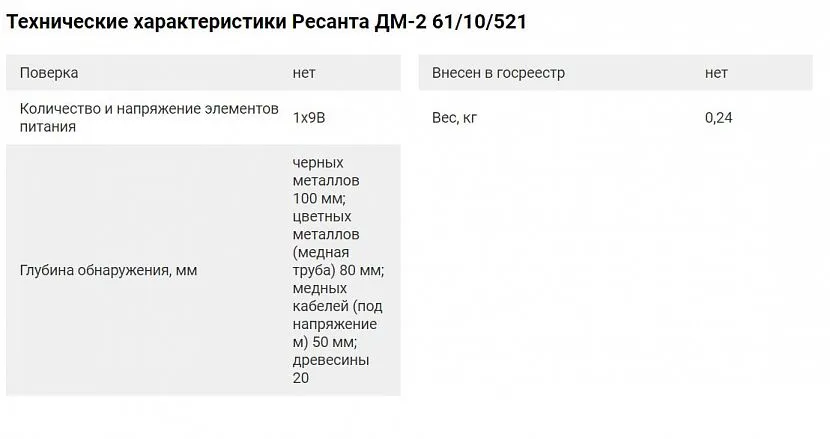 Прибор обладает стандартным набором показателей — температурный рабочий диапазон от -10 °С до +50 °С, индикация заряда, 9-вольтовая батарейка. Погрешность определения глубины — в пределах 1 см.
