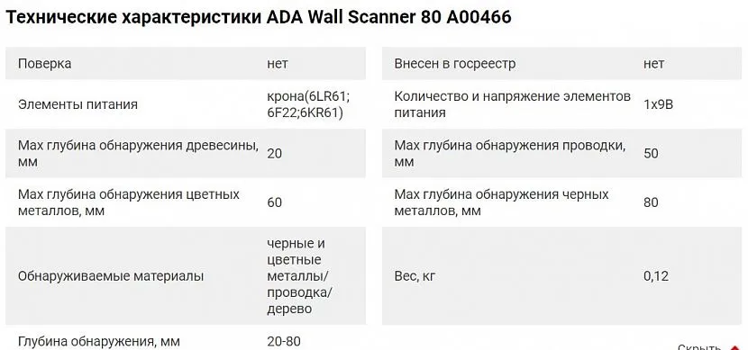 Технические характеристики ADA instruments Wall Scanner 80 Источник kazan.vseinstrumenti.ru