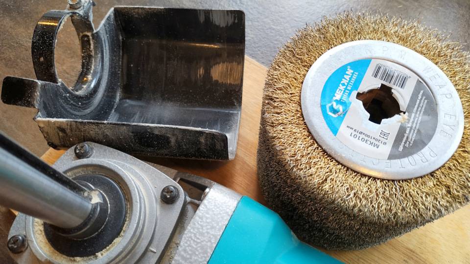 - Подготовительные работы. Изначально производится грубая шлифовка при помощи обдирочной насадки. Она имеет вид чаши с витой проволокой, расположенной по всему периметру (внешне похожа на щётку с металлической щетиной). На этом этапе с доски снимаются старые слои лакокрасочных материалов.