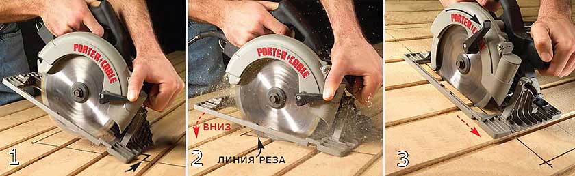 Когда плоское основание полностью ляжет на фанеру, продолжайте делать пропил вперед до переднего угла (рис. 3). Вынимайте пилу, только когда диск полностью остановится.