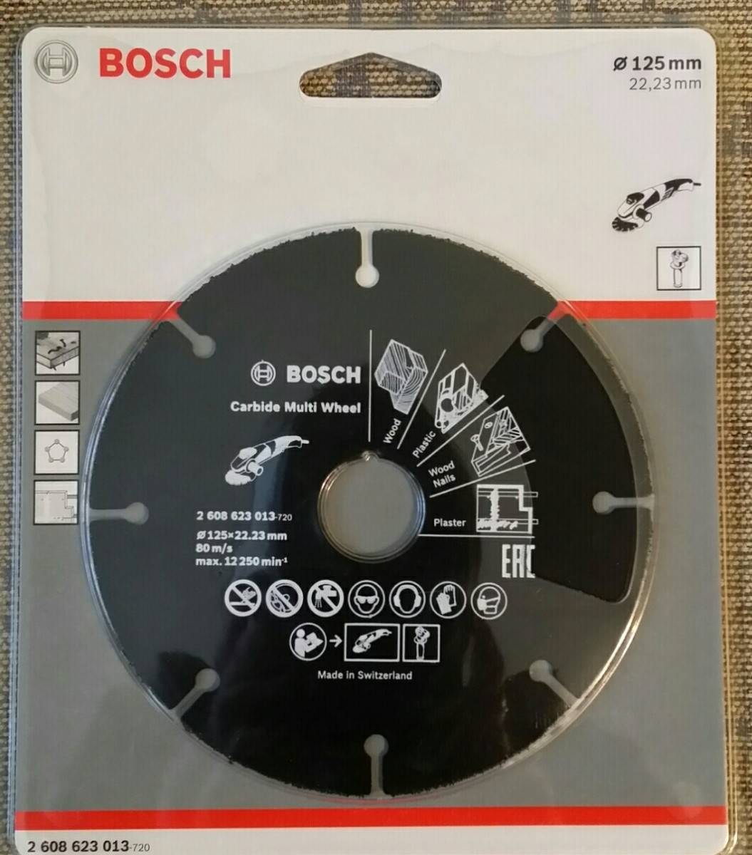 Отрезные диски карбид вольфрамового состава производятся относительно недавно, пользуются популярностью при работах болгаркой. Универсальный инструмент не оснащен зубьями, вместо отрезных элементов расположены вырезы в диске. Работа инструмента наиболее безопасна при распиле древесины, исключает заклинивание при попадании гвоздей или толстых прутков дерева. Внешний вид походит на алмазный диск резки бетона, предназначение указано на упаковке или инструкции.