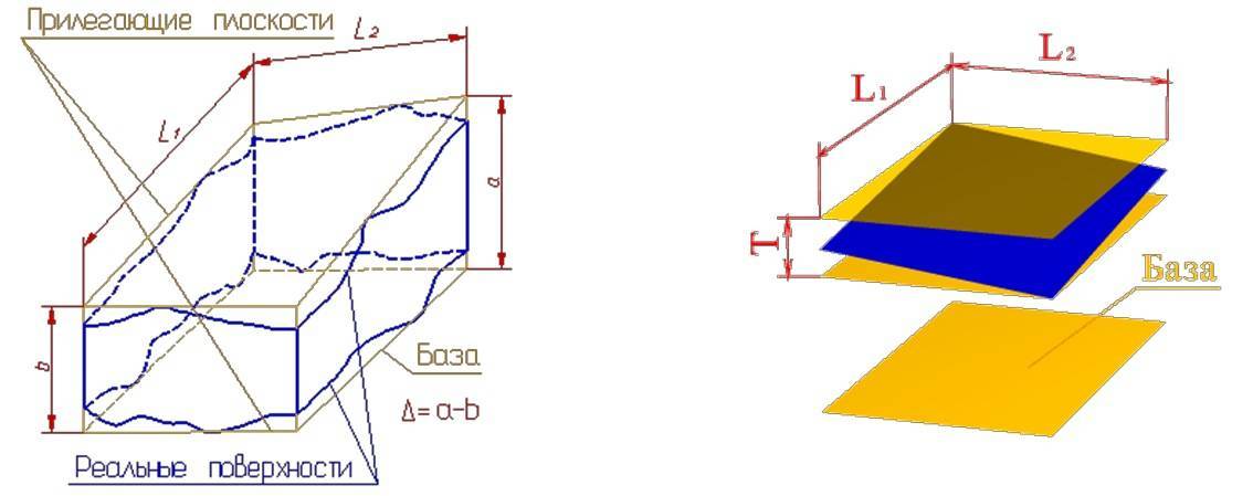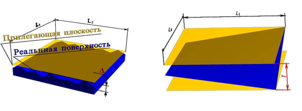 Отклонение от плоскостности — наибольшее расстояние Δ от точек реальной поверхности до прилегающей плоскости в пределах нормируемого участка.