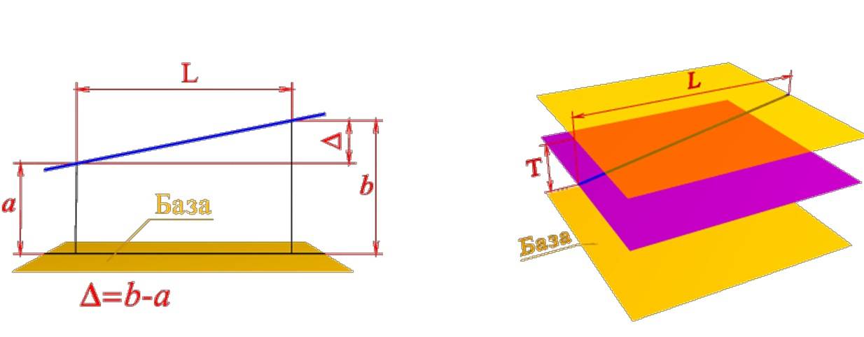 Отклонение наклона плоскости относительно плоскости или оси (или прямой) — отклонение угла между плоскостью и базовой плоскостью или базовой осью (прямой) от номинального угла, выраженное в линейных единицах Δ на длине нормируемого участка.