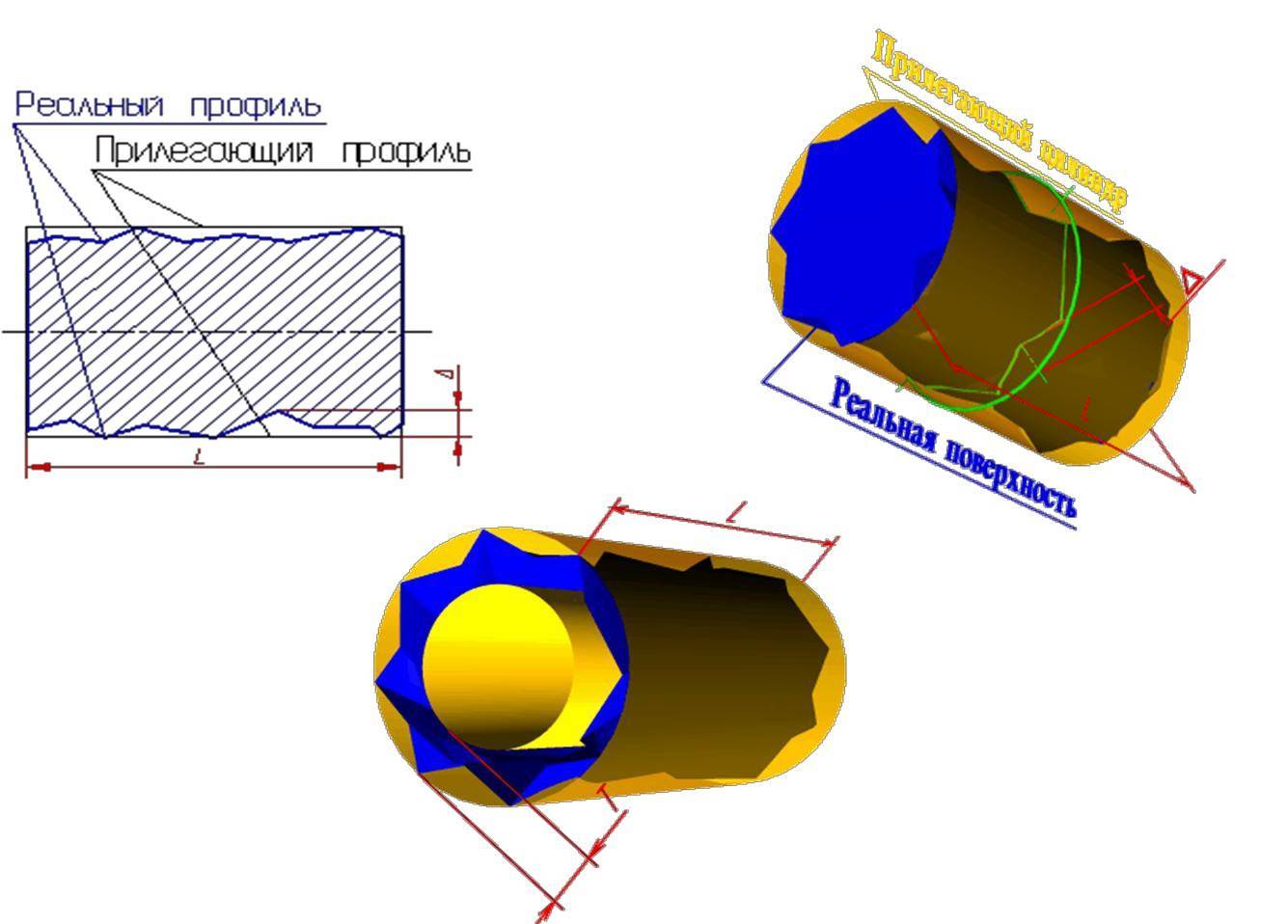Отклонение от цилиндричности — наибольшее расстояние Δ от точек реальной поверхности до прилегающего цилиндра в пределах нормируемого участка.