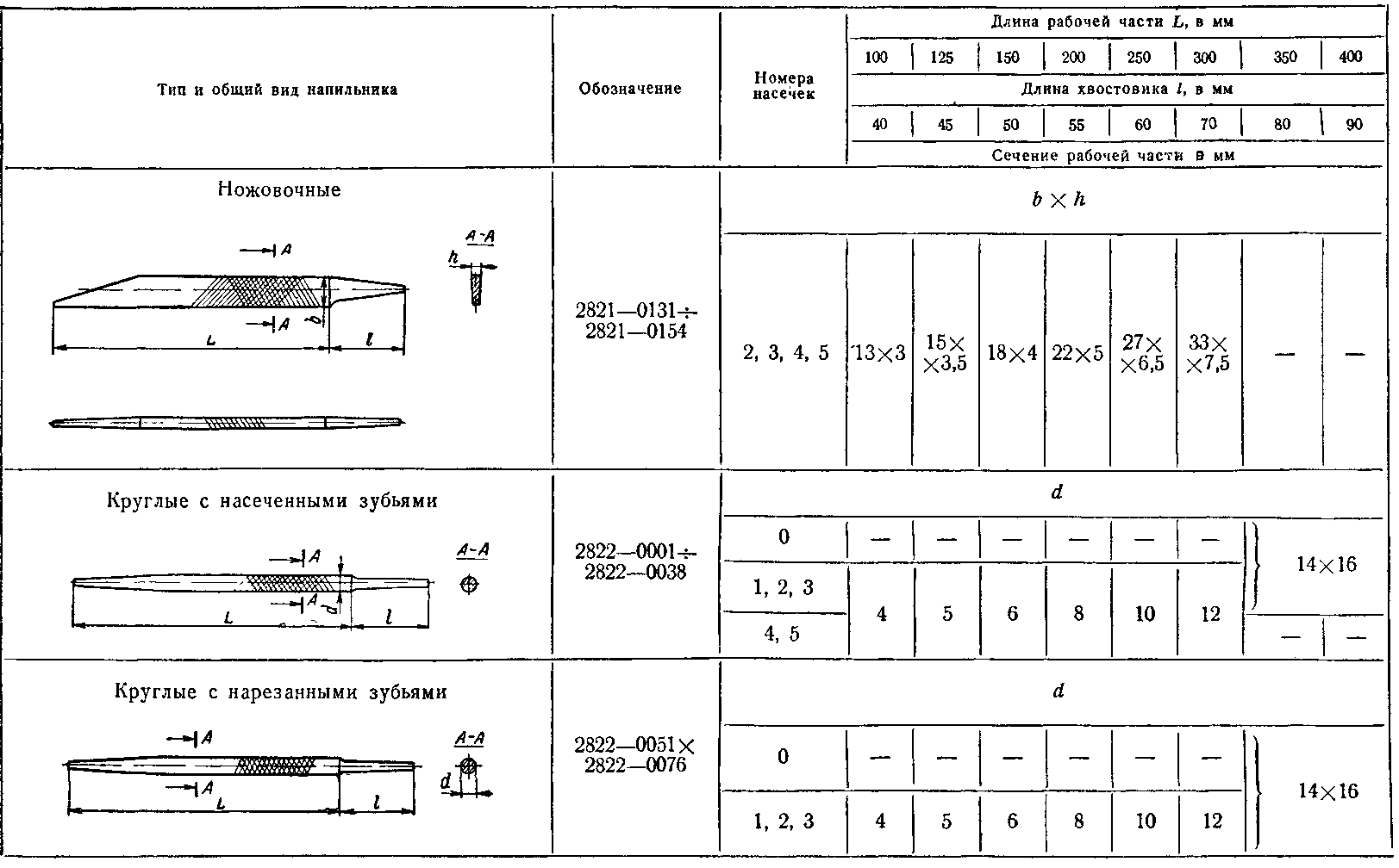 Надфили плоские тупоносые, плоские остроносые, квадратные, трехгранные, круглые, полукруглые, ромбические, пазовые изготовляют двух размеров: по длине рабочей части 60 и 80 мм и длине хвостовика соответственно 60 и 80 мм.