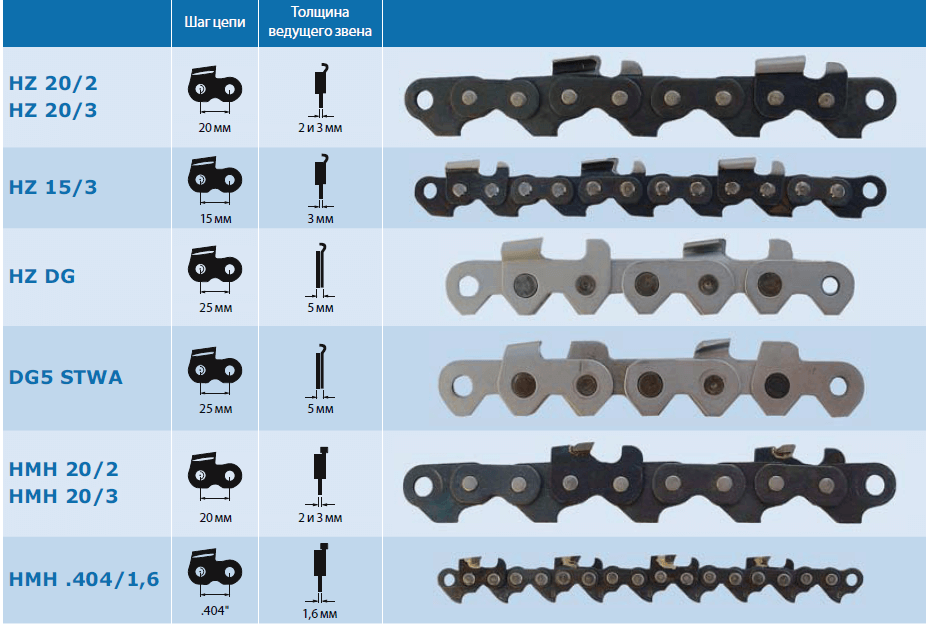 Профиль. Имеется в виду высота режущей кромки цепи над шиной. По этому показателю пильные цепи распределяются на два типа: низкопрофильные и высокопрофильные. Цепи с низким профилем более безопасны в использовании, тогда как высокий профиль обеспечивает высокую производительность работы. Кроме того, цепи распределяются по профилю режущих зубьев: полудолотообразные , долотообразные, закругленные и зубья с победитовой напайкой.