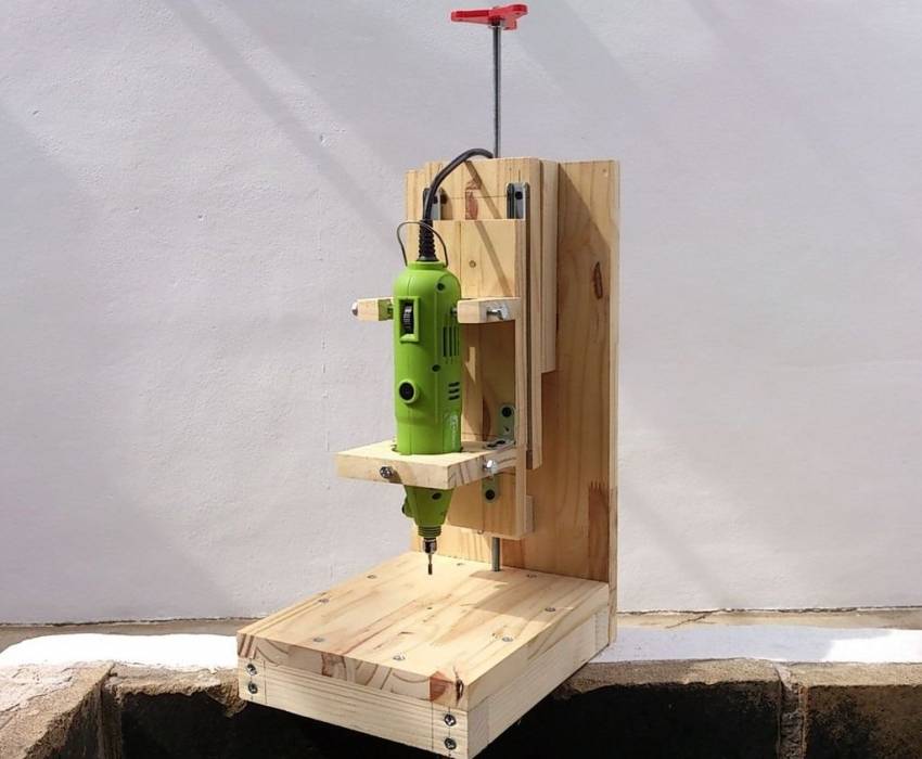 Они должны располагаться строго перпендикулярно. В подошве делается отверстие под выход инструмента. Стойка по ширине равна размеру корпуса электродрели и на 20 мм длиннее. На ней с помощью хомута, расположенного выше патрона, крепится дрель. Она дополнительно фиксируется упором, прижимающим тыльную сторону корпуса с обратной стороны от шпинделя, или вторым хомутом ниже ручки. Косынка обеспечивает жесткость конструкции. Одна сторона прилегает к подошве, вторая к стойке.
