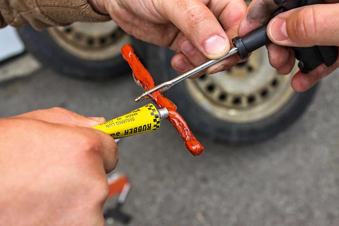 Однако и тут все не так просто: клеевая основа заплатки сама по себе очень слабая и просто так не приклеится. На шиномонтажах с шины счищают внешний слой, обезжиривают поверхность, наносят клей-активатор и на шину, и на «ножку грибка» и только потом устанавливают заплатку, прижимая ее специальным ручным катком.