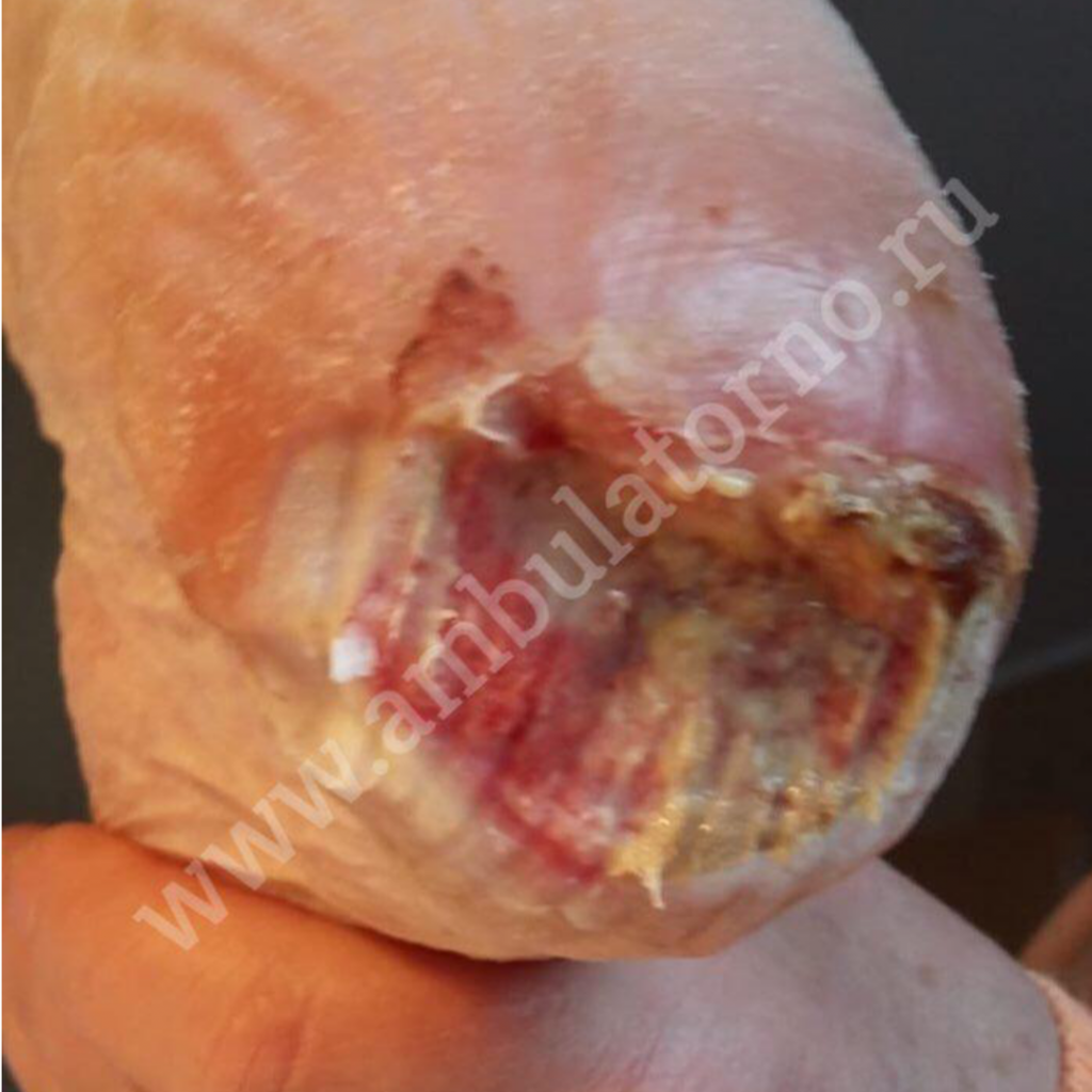 Фото 1 Вид пролежня на пятке перед началом гидротерапии