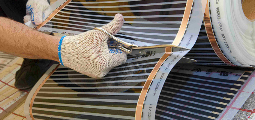 - Режется пленка по специальным прорисованным линиям, и раскладывают на полу, медной стороной вниз, согласно рисунку проекта, причем укладывать контактами к той стене, на которой будет терморегулятор.