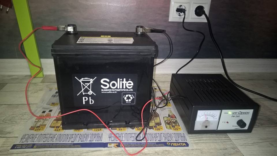 Попадающее в зарядное устройство напряжение преобразуется из переменного в постоянное — 15 В. Когда уровень заряда падает, уменьшается плотность электролита. Также о нехватке питания сигнализирует расцветка индикатора на крышке. Теоретически, можно зарядить батарею при помощи ЗУ от шуруповерта. Но нельзя быть уверенным, что зарядка точно подойдет и не сработает встроенная защита.