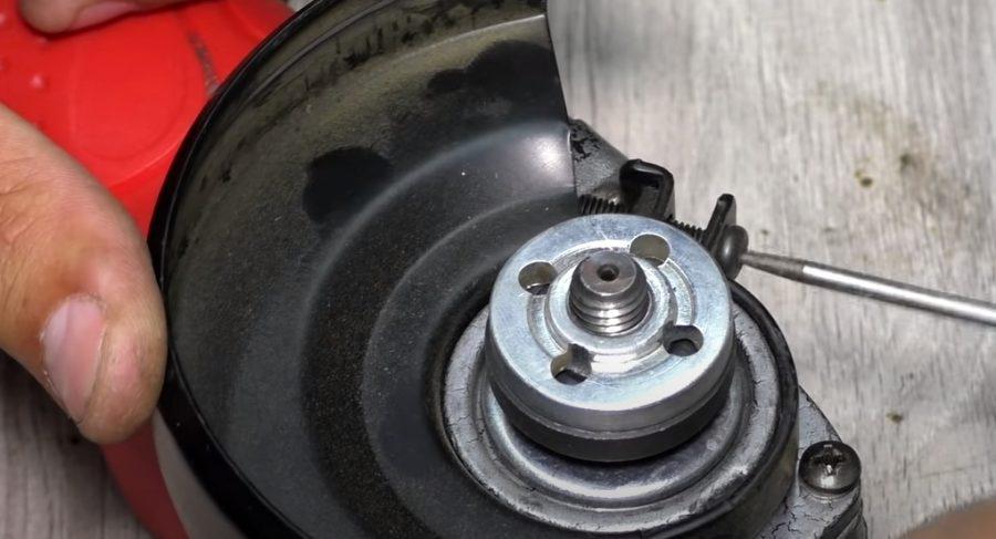 - Для начала разбираем болгарку. Снимаем диск и откручиваем кожух.