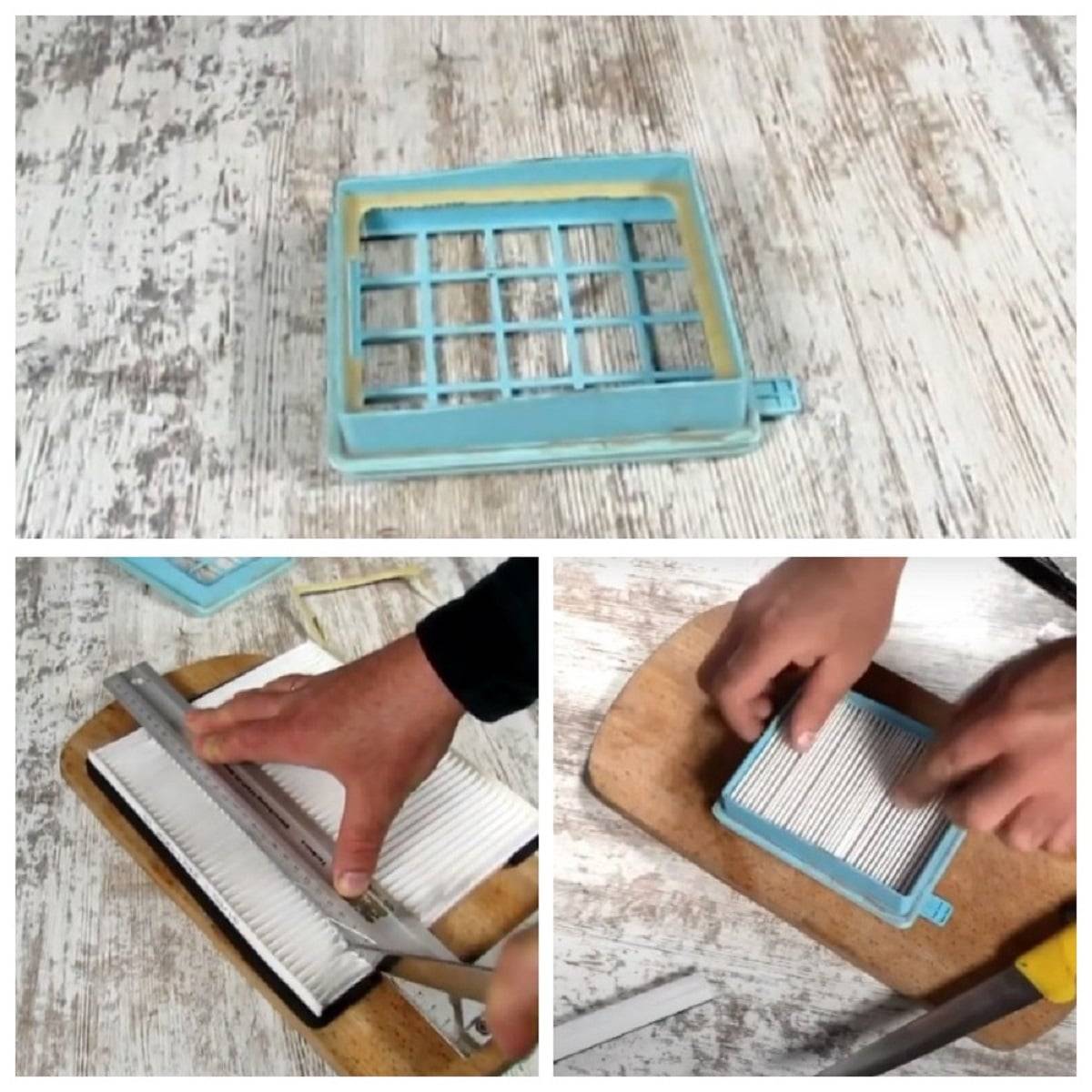 В пылесосном фильтрационный материал удаляется с помощью ножа. Места стыковки очищаются от старого клея, обезжириваются. Вставляется автомобильный элемент, который к рамке приклеивается любым клеевым составом.