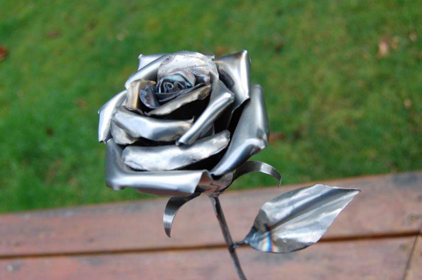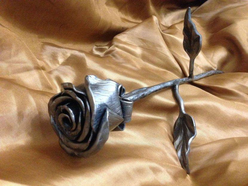 Цветы. С помощью ковки можно создать поделки в виде различных цветов. На фото представлена металлическая роза. Ее лепестки и листья изготавливаются из листового металла толщиной 0,3-0,5 мм. Для стебля можно использовать стальную проволоку или пруток. Вначале из картона вырезаются шаблоны деталей, которые переносятся на металл. Заготовки аккуратно вырезаются ножницами по металлу. Заусенцы удаляются. Ковка нужной формы осуществляется с помощью молотка. Края лепестков загибаются круглогубцами. Лепестки собираются в цветок и скрепляются внизу пайкой. Листья и цветочная чашечка крепится к стеблю проволокой или хомутами. Для такой поделки рекомендуется подбирать сталь, в которой содержание углерода не превышает 0,3%, и отсутствуют хром, сера и фосфор.