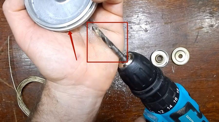 Затем просверлите по окружности механизма отверстия под тросик или леску. Диаметр отверстий зависит от толщины тросика. Если он достигает 2 мм, то отверстие должно составлять 3 мм. Количество отверстий определяется индивидуально, обычно достаточно 4-6 штук. Отверстия должны находиться друг от друга на равном расстоянии, поэтому с помощью линейки нужно будет сделать разметку.