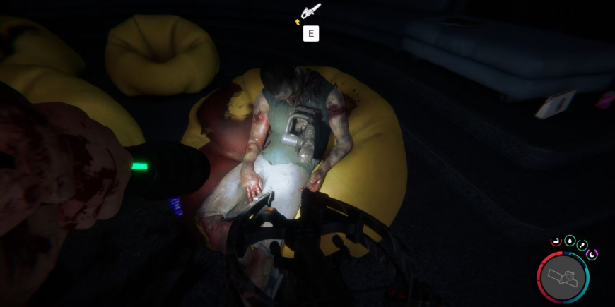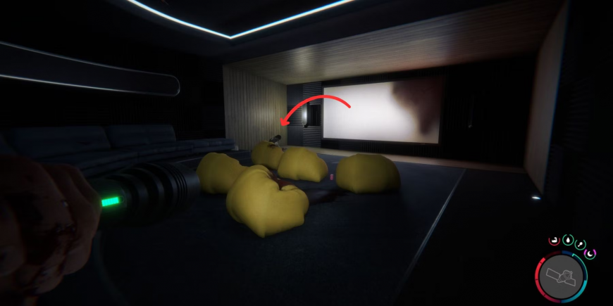 Заберите ее, а затем вернитесь к бару у бассейна и посмотрите налево, где находится еще один набор защитных дверей. Откройте двери с помощью карточки гостевой, чтобы попасть в другой ярко освещенный коридор, похожий на тот, что вел к входу в центр отдыха; только здесь путь преграждает пара мутантов. Пройдите дальше по коридору в еще одну небольшую комнату отдыха, которая ведет в кинозал с желтыми креслами-мешками. В одном из передних левых кресел внутри трупа лежит бензопила.