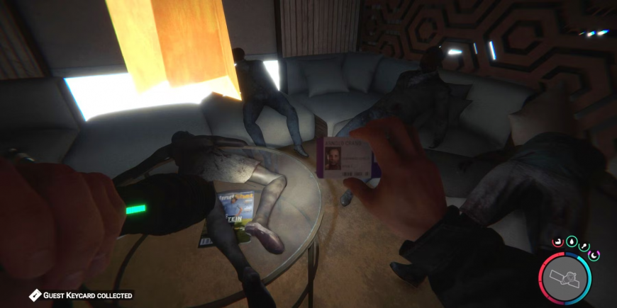 Идите налево и разберитесь с мутантами или пробегите мимо них, минуя стойку администратора. Две большие полувинтовые лестницы на второй этаж будут находиться в задней части следующей комнаты, за стеклянными дверями. Там также будет больше мутантов, поэтому будьте осторожны, прежде чем подниматься по лестнице. Далее игроки должны пройти через бар у бассейна и попасть в приватный клубный зал на втором этаже. Они поймут, что находятся в нужном месте, когда увидят в центре покойника с засунутой в горло гитарой. Пройдите в заднюю часть клуба к кабинкам, и на заднем правом столе с пятью трупами будет лежать ключ-карта гостевой.