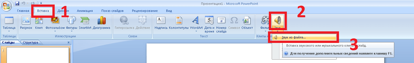 1 ) Закладка «Вставка», 2)затем «Звук / 3)Звук из файла»; 1 2 3