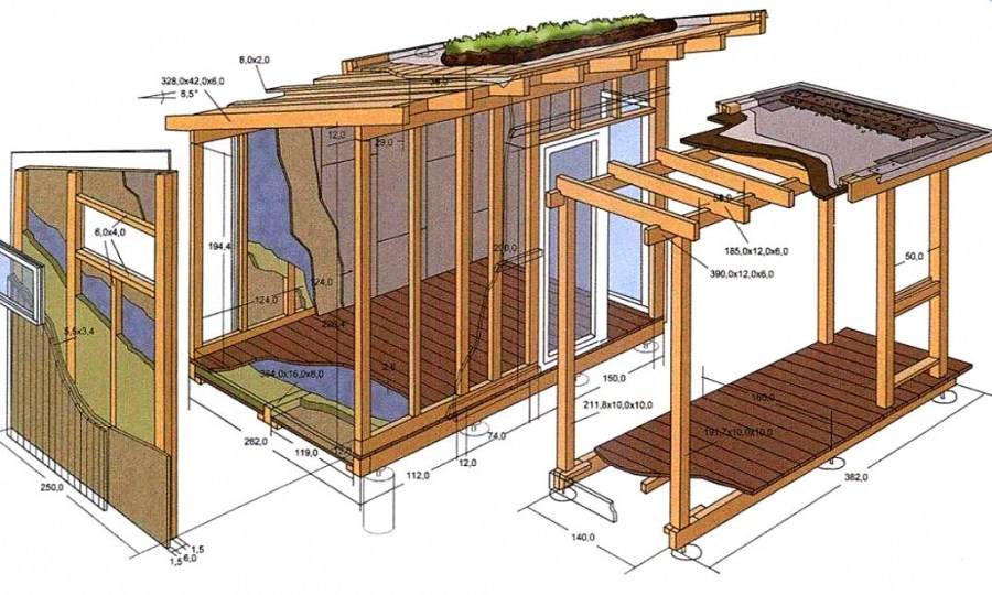 Хоть и много на рынке строительных материалов, при строительстве бытовок используют только самые легкие, практичные и недорогие. Дачные бытовки многими первоначально рассматриваются как временный вариант — в планах строительство домика. Но строение часто настолько прочно «прирастает», что из него либо делают гостевой домик, либо летнюю кухню, либо используют еще каким-то образом. Так что, даже если в решили, что это — только временный вариант, выбирайте материалы и размеры исходя из большего удобства.