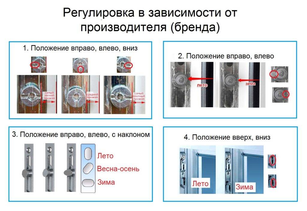 Методы регулировки крепежных элементов, конструктивные особенности отдельных деталей и требующийся для подгонки набор инструментов могут отличаться для окон ПВХ от разных фирм-изготовителей, однако базовые принципы, изложенные в инструкции по регулировке пластиковых окон самостоятельно, одни и те же (см. рисунки).