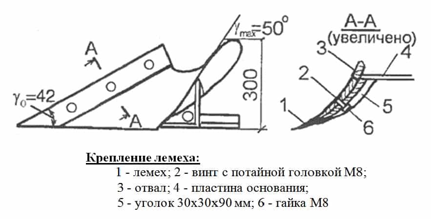 - Лемех и отвал соедините между собой максимально плотно. Между верхней частью отвала и ножом лемеха должен образоваться угол в 8 °;