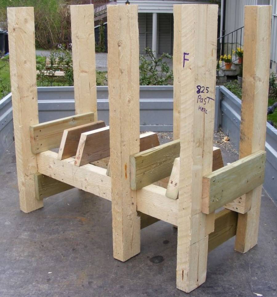 Козлы для пилки дров механизированным инструментом можно сделать по классической схеме – две симметричные Х-образные стойки с поперечиной. Однако, в этом случае высока вероятность зажима цепной пилы в момент завершения реза. Этот момент нельзя назвать приятным и безопасным при работе скоростной пилой.