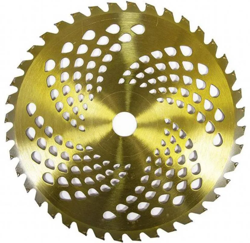 - Дисковый нож. Диск, усеянный мелкими острыми зубьями, изготавливается из металла с твердосплавными напайками. Количество зубьев колеблется в пределах 40-80 штук; чем их больше, тем эффективнее инструмент справляется с укосом самой разной растительности, от бурьяна до мелких деревьев.