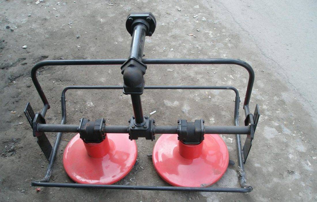 Совет!Перед дисками закрепить раму из трубы или уголка, если в траве попадется камень, она не допустит повреждения рабочих частей.